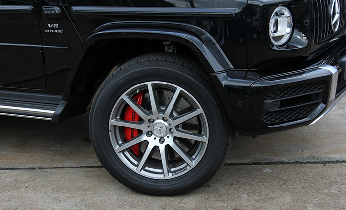 Dòng chữ V8 Bi-Turbo nằm trên sườn xe như một lời khẳng định cho quyền lực thực sự ẩn giấu bên vẻ ngoài mạnh mẽ của chiếc SUV AMG này. Nổi bật hơn cả ở góc nhìn ngang là bộ mâm hợp kim 7 chấu kép kích thước 22 inch, được sơn màu xám titan và có độ bóng cao.