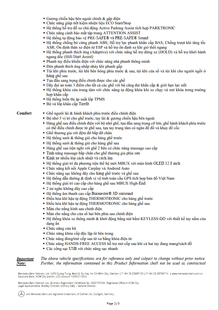 Sự an toàn của Mercedes S450 còn thể hiện qua hệ thống phòng ngừa va chạm Collision prevention assist plus qua chức năng phanh tự động giúp ngăn chặn tình huống va chạm có thể xảy ra bất cứ lúc nào. Mặt khác, để đảm bảo độ an toàn cho Mercedes S450 cũng như chủ nhân, công nghệ attention assist cảnh báo mất tập trung, cùng hàng loạt các công nghệ, thiết kế hệ thống phanh hiện đại tiêu chuẩn quốc tế như: phanh tay điều khiển tự động, ABS – hệ thống chống bó cứng phanh, hệ thống phanh adaptive hỗ trợ dừng xe ngang dốc …cũng được đưa vào Mercedes S450