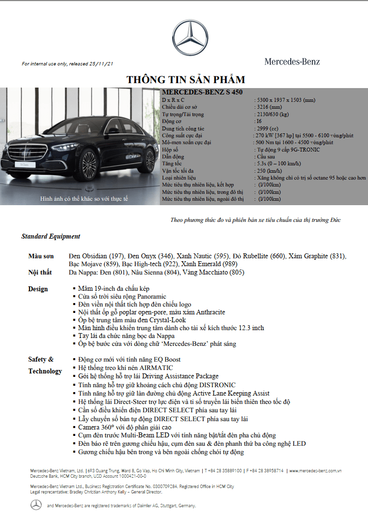 Không chỉ đơn thuần là một phương tiện đi lại, Mercedes S450 niềm tự hào số 1 của người Đức về công nghệ sản xuất ô tô hiện đại bậc nhất thế giới. Siêu phẩm mang tới cảm xúc khó tả – chiếc xe vượt lên cả giá trị thực tế khi được bán ra trên thị trường bởi những thiết bị cao cấp, thiết kế kì công, kĩ càng tới từng chi tiết. Những gì Mercedes S450 làm được là điều khiến hàng triệu người yêu thích thương hiệu Mercedes không khỏi trầm trồ, thán phục, Mercedes S450 – phương tiện làm nên phong cách hào hoa, sang trọng, điểm nhấn ấn tượng lôi cuốn bạn ngay từ cái nhìn đầu tiên.