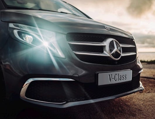 Thiết kế phần đầu xe Mercedes-Benz V 250 Luxury cuốn hút bởi lưới tản nhiệt 2 nan đơn và hốc gió mở rộng, liền khối. Cụm đèn trước LED toàn phần (Full-LED) thông minh với chức năng tự động bật tắt, điều chỉnh ánh sáng xa gần để không làm chói mắt người điều khiển các phương tiện đi ngược chiều.