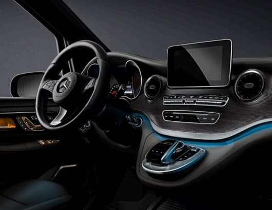 Khoang nội thất Mercedes-Benz V 250 Luxury còn ghi điểm nhờ vẻ đẹp sang trọng đến từ các vật liệu cao cấp như da, gỗ và hợp kim nhôm. Đèn viền nội thất điều chỉnh 3 màu sắc và độ sáng, giúp không gian bên trong ấn tượng hơn.